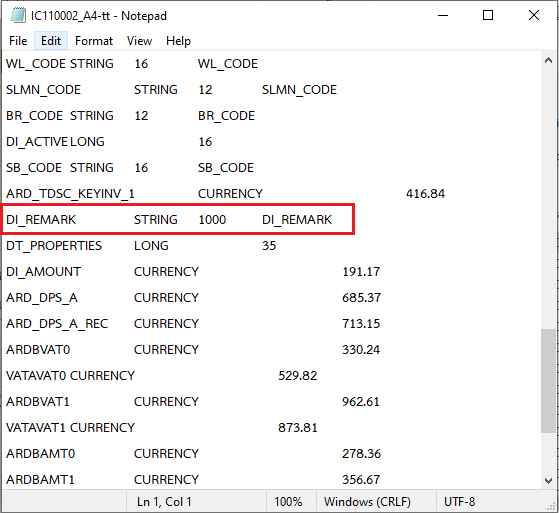 5. เปิดไฟล์ .ttx เพื่อตรวจสอบข้อมูล String ที่กำหนดขนาดฟิลด์ของ DI_REMARK
