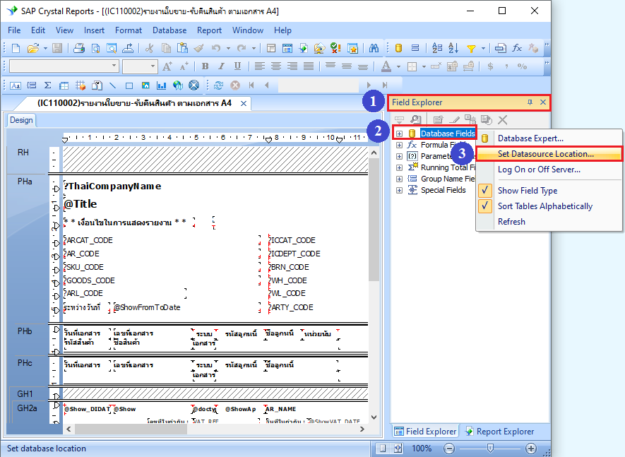 7. ไปที่แถบ Field Exploer > คลิกขวาที่ Database Fields > เลือกเมนู Set Datasource Location… ดังภาพ