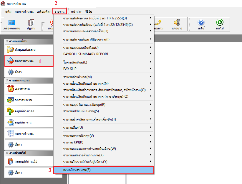 1. เปิดโปรแกรม Business plus HRM หรือโปรแกรมเงินเดือน > เมนูงานเงินเดือน ผลการคำนวณ > แถบเมนูรายงาน > เลือกเมนู “ลงทะเบียนรายงาน”