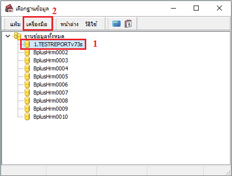 1) เปิดโปรแกรม Business plus HRM คลิกเลือกฐานข้อมูล > เลือกแถบเมนู “เครื่องมือ” ดังภาพ
