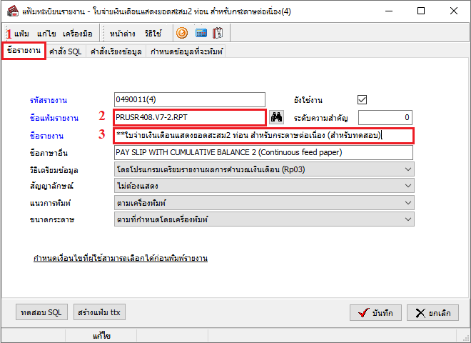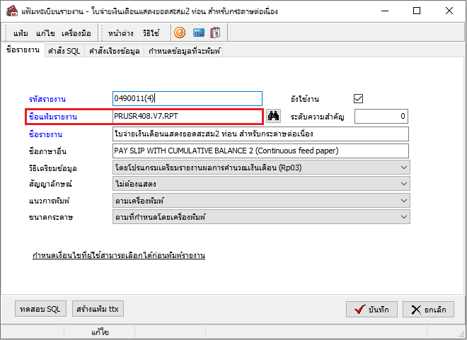 ตรวจสอบชื่อไฟล์รายงาน .rpt ก่อนการแก้ไขได้ที่หน้าแฟ้มลงทะเบียนรายงาน