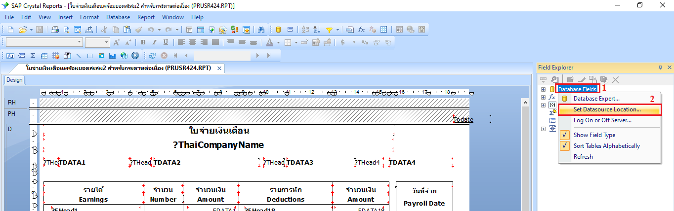 15.ไปที่ Field Explorer > คลิกขวาที่ Database Fields > เลือกเมนู Set Datasource Location…