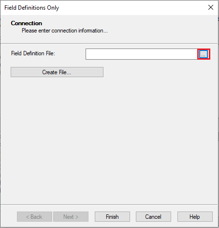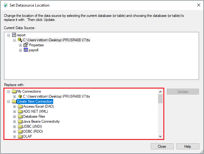 16.โปรแกรมจะแสดงหน้าต่าง Set Datasource Location ทำการเลือกข้อมูลในส่วนของ Replace with: ดังนี้ เลือก Create New Connection > More Data Sources > ดับเบิ้ลคลิกที่ Field Definitions Only