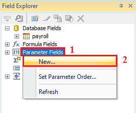 20.จากนั้นไปที่แถบขวามือ Field Explorer > คลิกขวาที่ Parameter Fields > เลือก “New…”