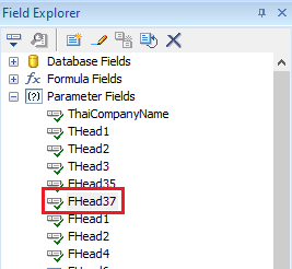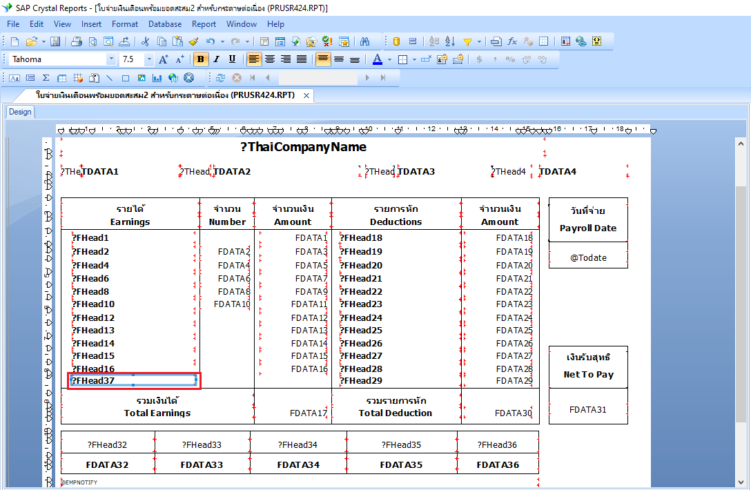 22.นำฟิลด์ Parameter Fields ที่สร้างชื่อ “FHead37” ไปวางในส่วนคอลัมน์รายได้ พร้อมตั้งค่าฟอนต์เป็น Tahoma ขนาดฟอนต์เป็น 7.5 ตัวอักษรหนา ตามรูปแบบของรายงานมาตรฐานที่กำหนด ดังภาพ