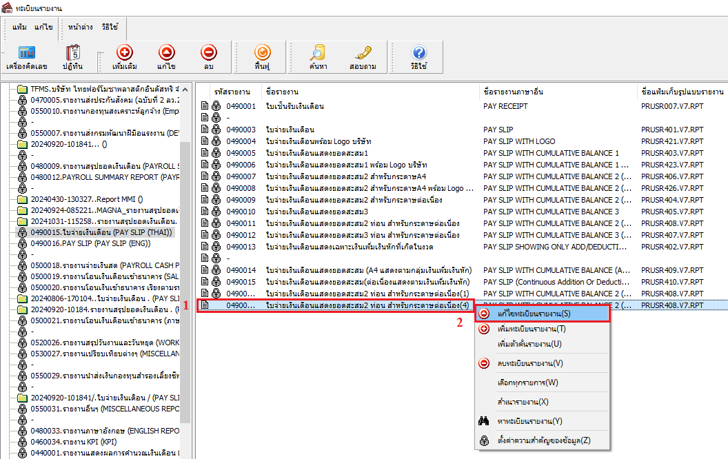 3. จากนั้นทำการคลิกขวารายงานที่สำเนา > เลือกเมนูแก้ไขทะเบียนรายงาน หรือดับเบิ้ลคลิกรายงานที่สำเนา ดังภาพ