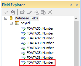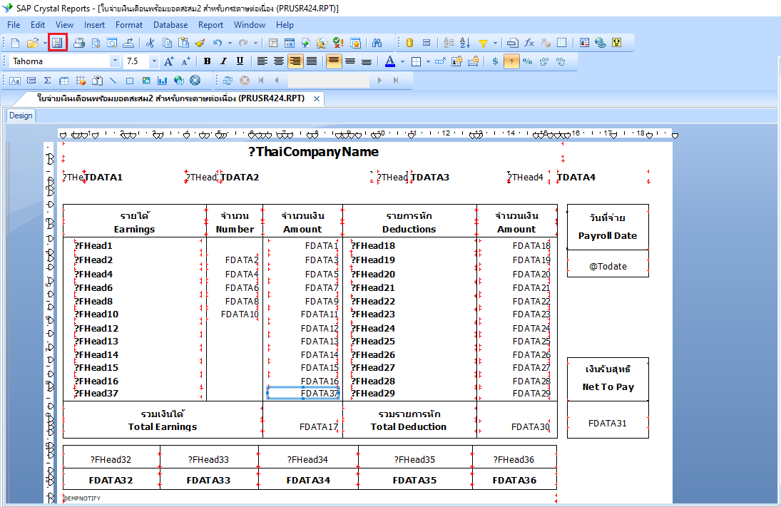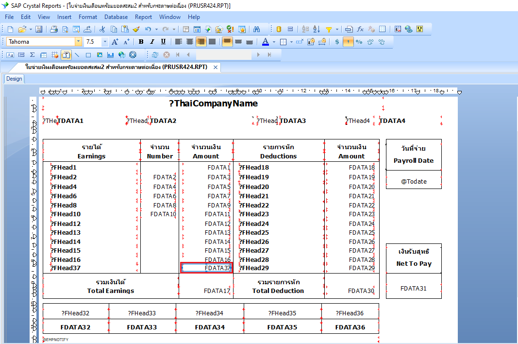 23.นำฟิลด์ Database Fields > payroll > ชื่อ “FDATA37” ไปวางในส่วนคอลัมน์จำนวนเงินในส่วนของรายได้ พร้อมตั้งค่าฟอนต์เป็น Tahoma ขนาดฟอนต์เป็น 7.5 ตามรูปแบบของรายงานมาตรฐานที่กำหนด ดังภาพ