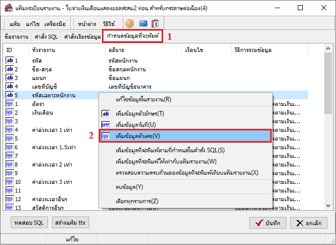 4. ระบบจะแสดงหน้าต่าง แฟ้มทะเบียนรายงาน ทำการเพิ่มข้อมูลทะเบียนรายงาน โดยไปที่แถบ กำหนดข้อมูลที่จะพิมพ์ > คลิกขวาพื้นที่ว่าง > เลือกเมนูเพิ่มข้อมูลตัวเลข ดังภาพ