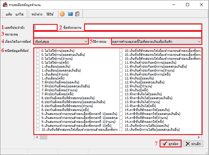 5.1 เลขที่ประจำตัว : กำหนดใส่เลขที่ประจำตัว โดยเลขนี้ห้ามซ้ำกับเลข ID ชนิดของข้อมูลที่มีในหน้ากำหนดข้อมูลที่จะพิมพ์