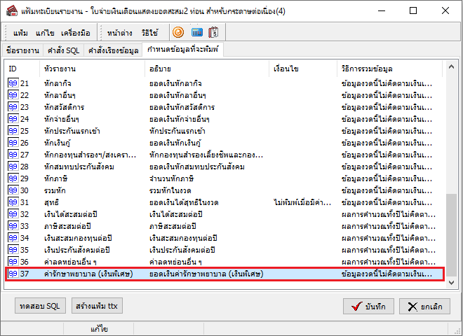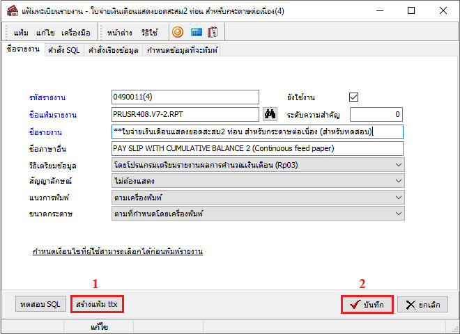 8. จากนั้นทำการสร้างแฟ้ม .ttx เพื่อนำไฟล์ไป convert รายงาน เนื่องจากไฟล์รายงาน .rpt ไม่มีข้อมูลสำหรับ ID ที่เพิ่มหรือสร้างขึ้นใหม่ และทำการคลิกปุ่ม “บันทึก”