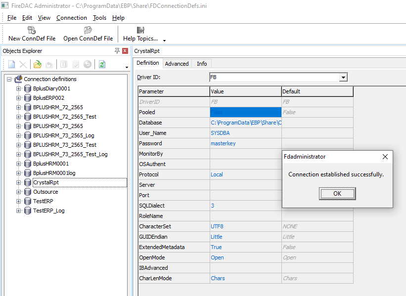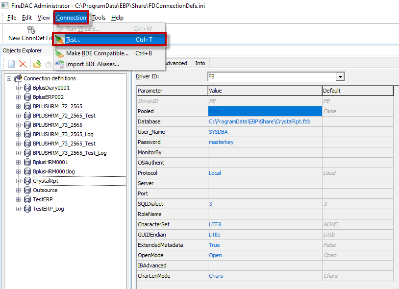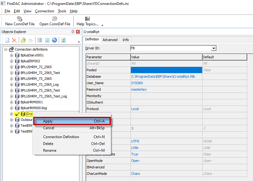 - แถบเมนู Connection definition ให้คลิ๊กที่ฐานข้อมูล CrystalRpt จะแสดงรายละเอียดต่างๆ ของฐานข้อมูลที่ด้านขวา > แถบเมนู Definition ในช่อง Database จะแสดงที่เก็บแฟ้ม CrystalRpt.fdb ให้แก้ไขเป็น C:/ProgramData/EBP/Share/CrystalRpt.fdb > ทำการคลิ๊กขวาที่ฐานข้อมูล CrystalRpt > เลือก Apply เพื่อทำการบันทึกการตั้งค่า