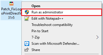 2. ทำการติดตั้งไฟล์ “Patch_FixLogoPrintDirectV31r5.exe” โดยการคลิกขวากดเลือก “Run as administrator”