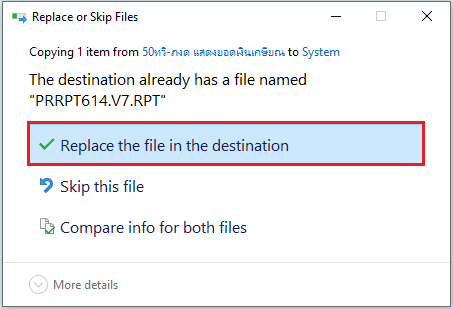 5. โปรแกรมจะแสดงแจ้งเตือน กรณีมีชื่อไฟล์รายงานซ้ำ ทำการคลิก Replace the file in the destination