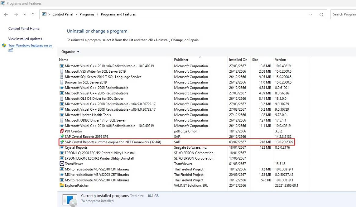 1. ถอนการติดตั้งโปรแกรม SAP Crystal Reports runtime engine 32 bit เดิมออก ตัวอย่างดังภาพ