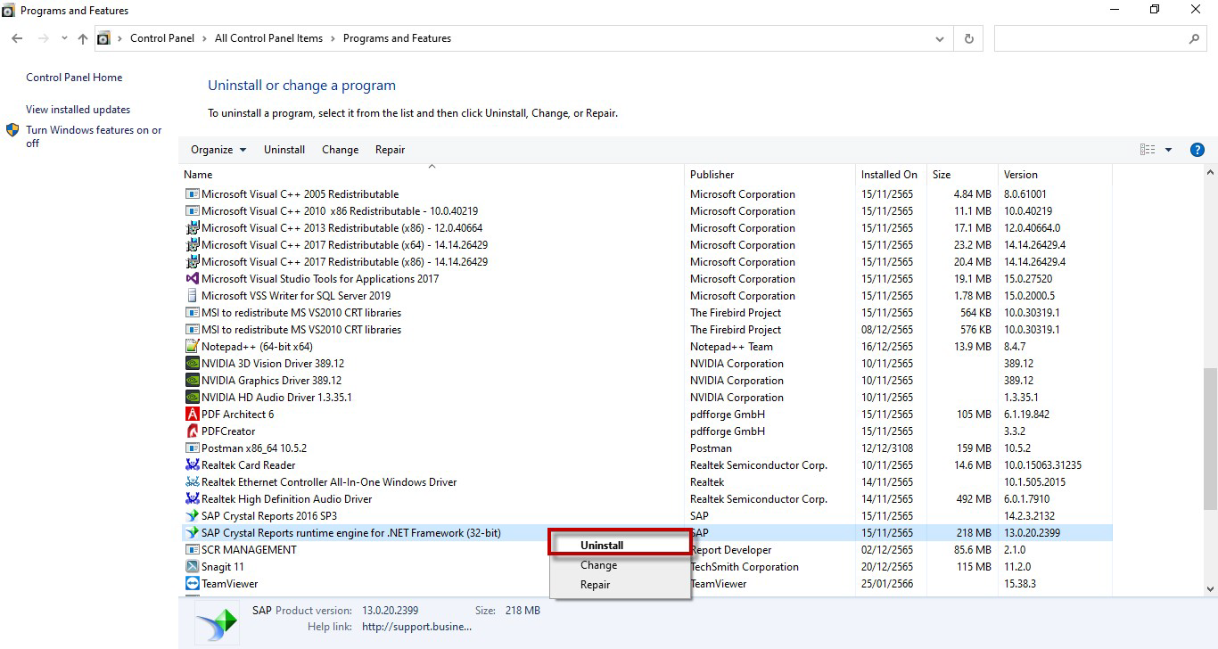 1. ทำการถอนการติดตั้ง SAP Crystal Reports runtime และติดตั้งใหม่โดย เข้าไปที่ Control Panel > เลือก Programs and Features > เลือกโปรแกรม SAP Crystal Reports runtime และทำการ Uninstall