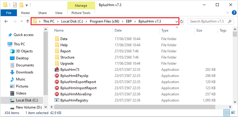 1. เปิดโฟลเดอร์ และไปที่ตำแหน่งที่ติดตั้งโปรแกรม Bplus HRM เช่น C:/Program Files (x86)/EBP/BplusHrm v7.3 ดังภาพ