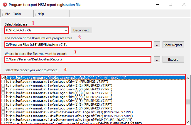 3.2 The location of the BplusHrm.exe program store. : เลือกที่อยู่ตำแหน่งที่เก็บแฟ้มรายงานที่ต้องการส่งออกรายงาน โดยคลิกปุ่ม “..” หรือนำ path มาวาง จากนั้นคลิกปุ่ม “Show Report”