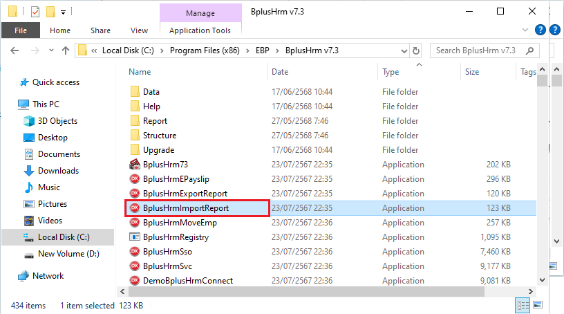 2. ดับเบิ้ลคลิกที่ไฟล์นามสกุล .exe ชื่อ “BplusHrmImportReport.exe” ดังภาพ