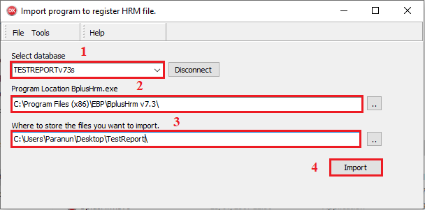 3.2 Program Location BplusHrm.exe : เลือกที่อยู่ตำแหน่งที่เก็บแฟ้มรายงานที่ต้องการนำเข้า โดยคลิกปุ่ม “..” หรือนำ path มาวาง