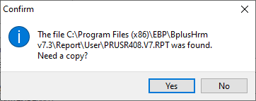 4. กรณีพบชื่อไฟล์รายงานซ้ำ ระบบจะแสดงหน้าต่างแจ้งเตือน “Confirm” สามารถคลิกปุ่ม “Yes” เพื่อนำเข้ารายงานและวางไฟล์ .rpt ทับไฟล์เดิมที่มีอยู่ หรือคลิกปุ่ม “No” เพื่อนำเข้ารายงานแต่ไม่ต้องการนำไฟล์ .rpt มาวางไว้ที่ตำแหน่งเก็บแฟ้มรายงาน