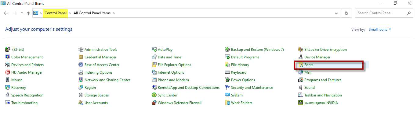 1. ทำการลบฟอนต์ Cordia New, Cordia UPC โดยเข้า Control Panel > เลือก Fonts หรือไปที่ Control Panel/All Control Panel Items/Fonts