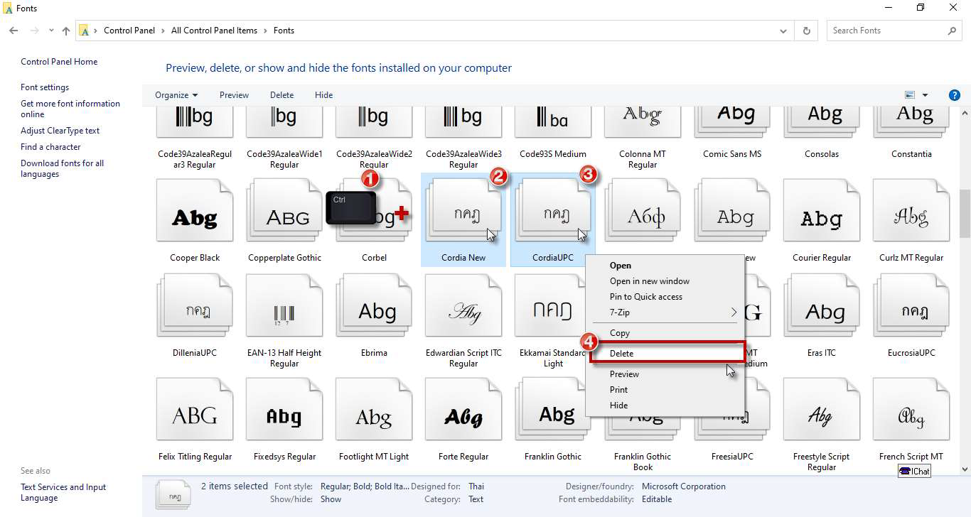 2. ทำการกดปุ่ม Ctrl ที่คีย์บอร์ด และคลิ๊กที่ฟอนต์ Cordia New, Cordia UPC เพื่อทำการเลือกฟอนต์ > คลิ๊กเม้าส์ขวา เลือก Delete เพื่อทำการลบฟอนต์