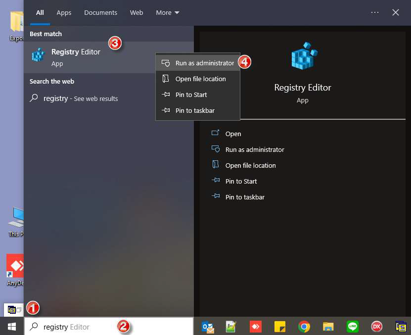 - การคลิ๊กที่ช่อง Search ของเครื่องคอมพิวเตอร์ > พิมพ์ registry > จะแสดง Registry Editor > คลิ๊กเมาส์ขวาเลือก Run as administrator