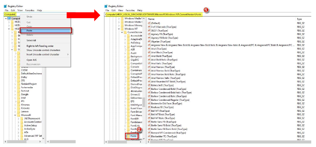 - หน้า Registry Editor > ให้ไปที่ตำแหน่งด้านล่าง โดยทำการคัดลอกตำแหน่ง Computer/HKEY_LOCAL_MACHINE/SOFTWARE/Microsoft/Windows NT/CurrentVersion/Fonts