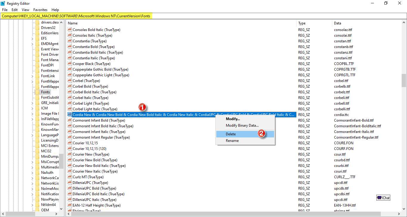 - ทำค้นหา Font Cordia UPC, Cordia New > คลิ๊กเม้าท์ขวา เลือก Delete เพื่อลบ และทำการติดตั้ง Font Cordia UPC, Cordia New ใหม่