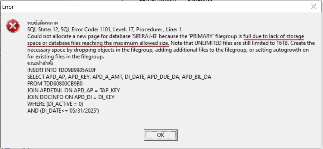สาเหตุ: เกิดจากพื้นที่จัดเก็บฐานข้อมูลมีไม่เพียงพอ สำหรับสร้างไฟล์หรือประมวลผลข้อมูลส่งผลให้เรียกรายงานแล้วแสดงข้อผิดพลาด ดังภาพ